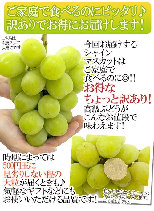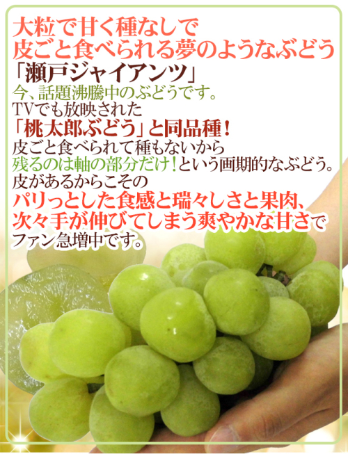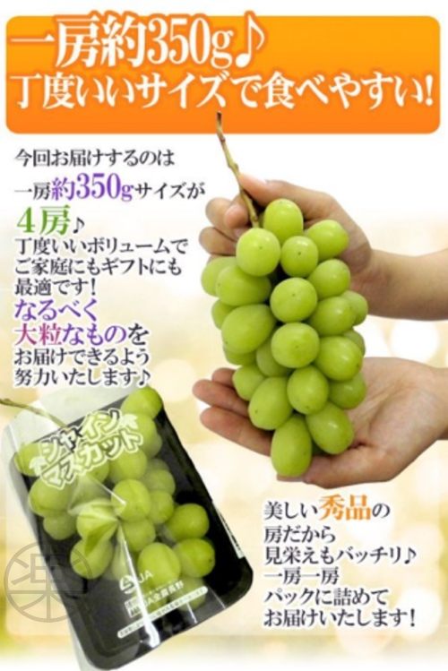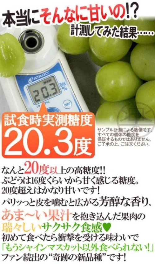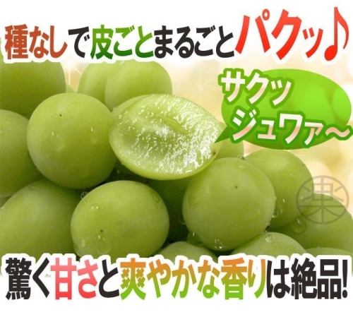 ?產量稀少,主要來自山梨、長野或岡山等地,屬日本頂級的無籽葡萄。由於外形極其漂亮,宛如蠟製品,所以也被戲稱為「假葡萄」,意謂美得像假的一樣!